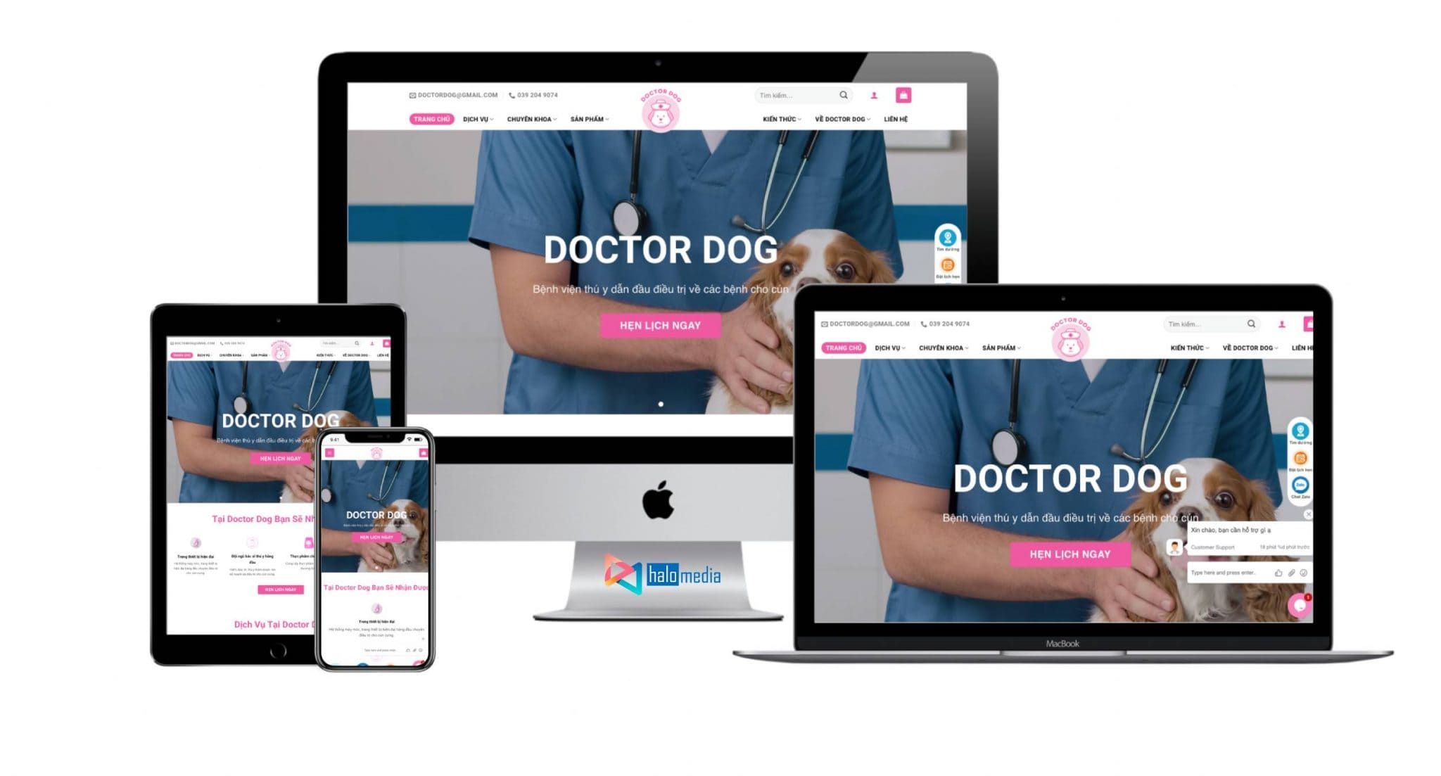Halo Media vinh dự được hợp tác cùng Bệnh viện thú y Doctor Dog để thiết kế website thú ý đẹp với đầy đủ chức năng theo yêu cầu. Với đội ngũ nhân viên và chuyên viên dày dặn kinh nghiệm, nhiệt tình và sáng tạo, dự án thiết kế website thú cưng Doctor Dog đã hoàn thành và các yêu cầu của website đã hoàn thiện về giao diện và chức năng: